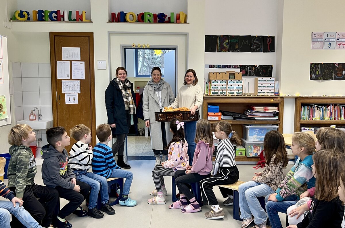 In diesem Jahr verteilten Frau Hartmann und Frau Blome die vom Förderverein gespendeten Stutenkerle gemeinsam mit unserer Schulleiterin Frau Wolf in allen Klassen. Die Freude war groß – sowohl bei den Kindern als auch im Kollegium.